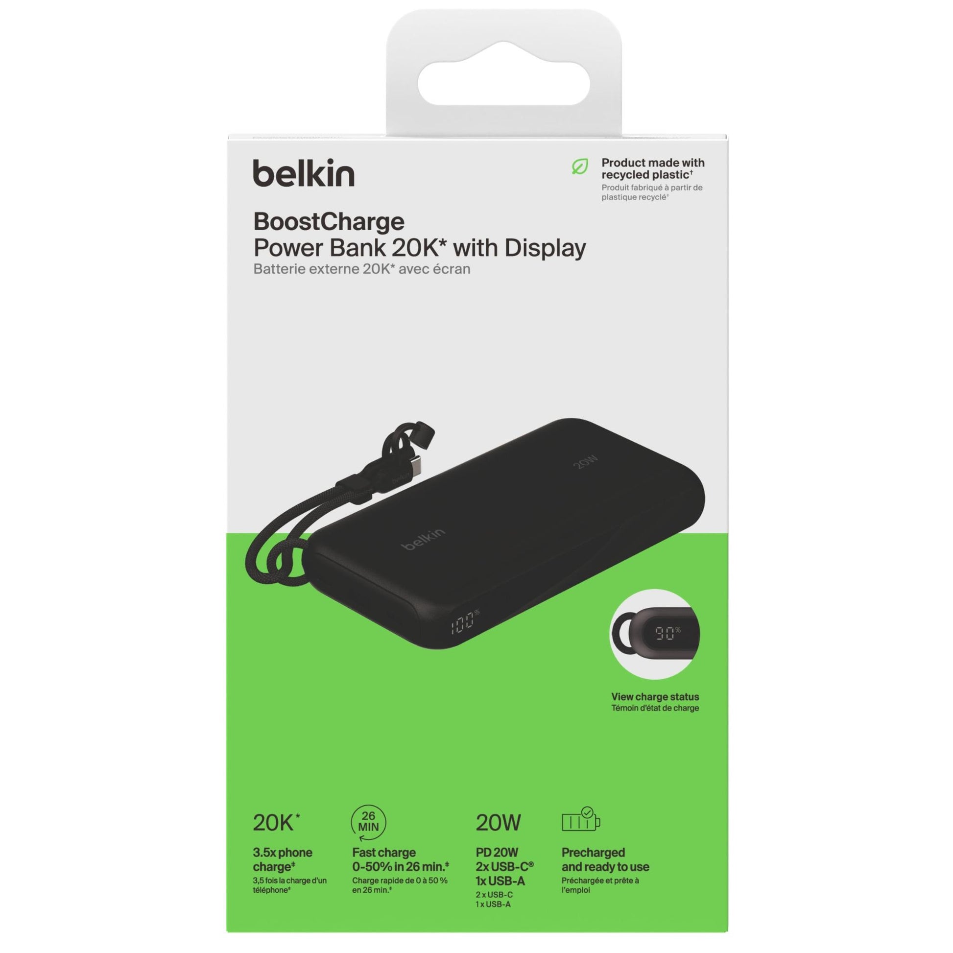A detachable USB-C cable makes charging easy with our travel-friendly 20K power bank.