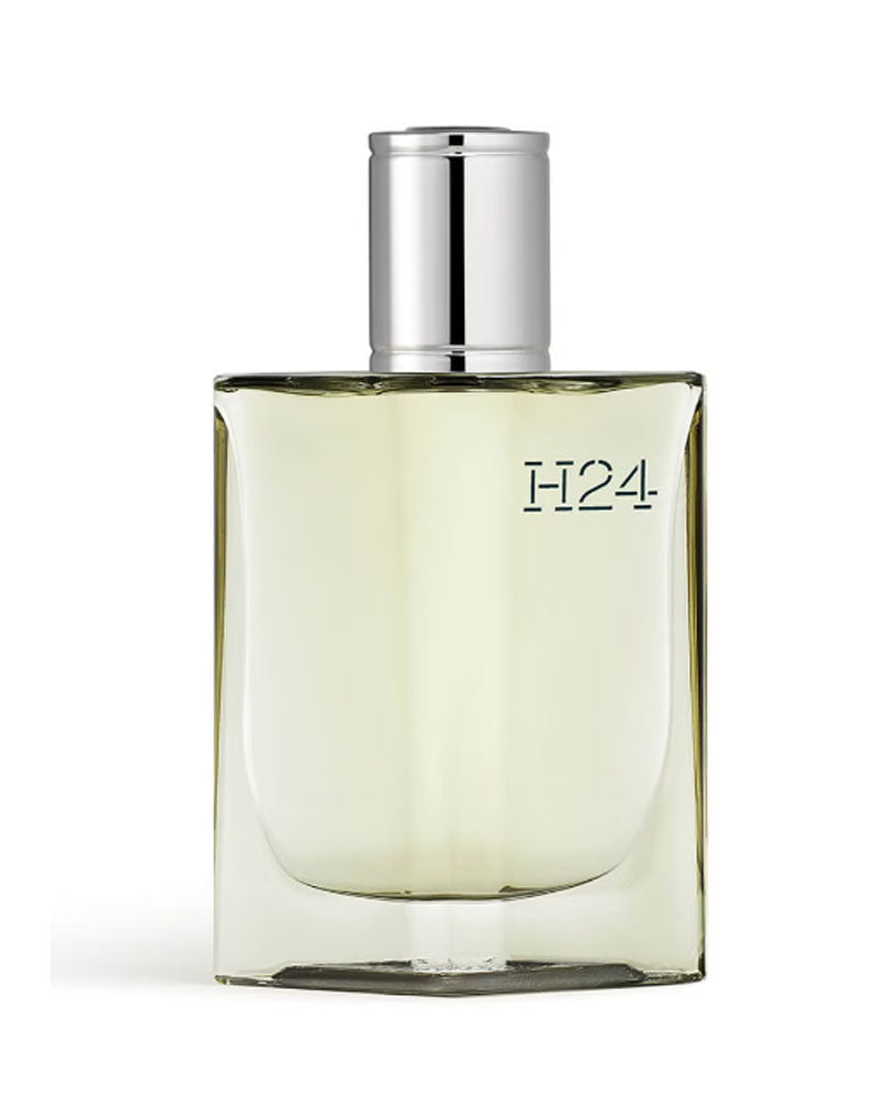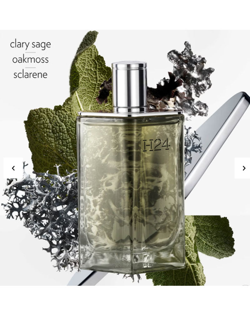 Hermes H24 Eau De Parfum Spray 100ml/3.3oz A woody aromatic fragrance for men H24 is the key to a new space; H for Hermès, Homme & Hours; 24 to evoke a relationship with time & a link to the House's flagship address of 24 rue du Faubourg Saint-Honore Warm, sensual, smooth, vibrant & enveloping The main raw materials & notes are clary sage, oak moss & sclarene The bottle designed by Philippe Mouquet is adorned with moss-green lacquer to echo the fragrance's olfactory notes The aerodynamic, refillable bottle is crafted from recycled glass & the box is made entirely of recycled fibers Launched in 2022 Made in France