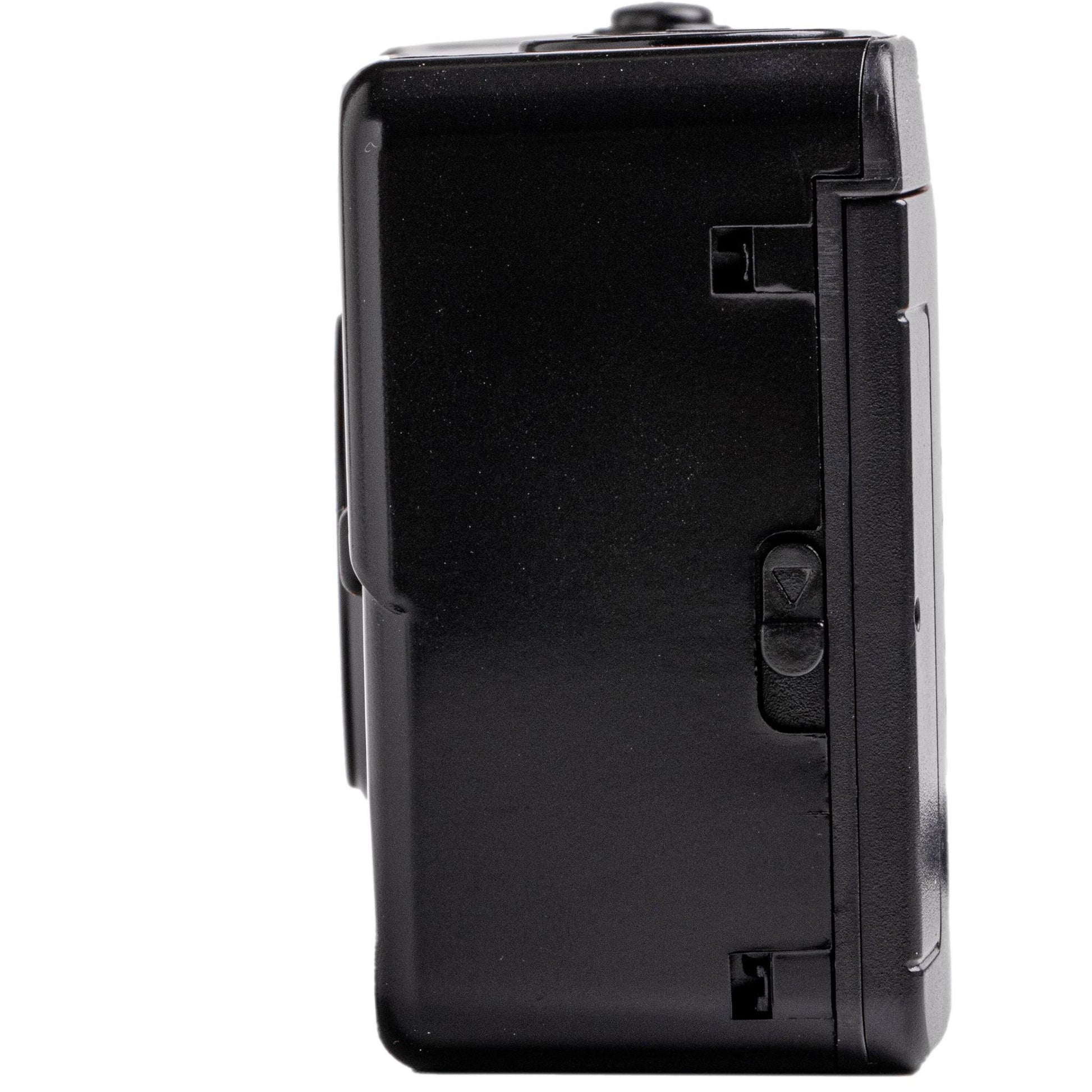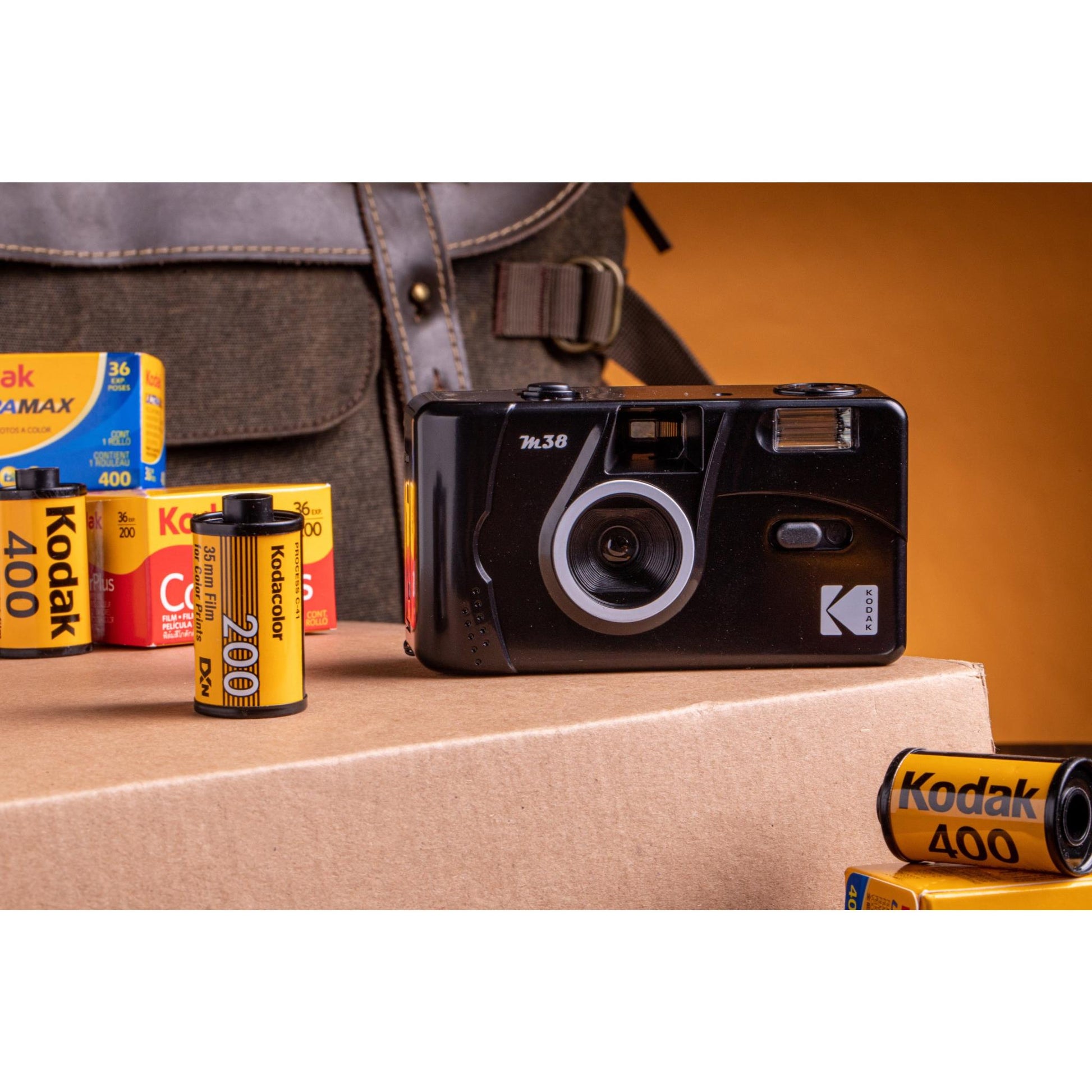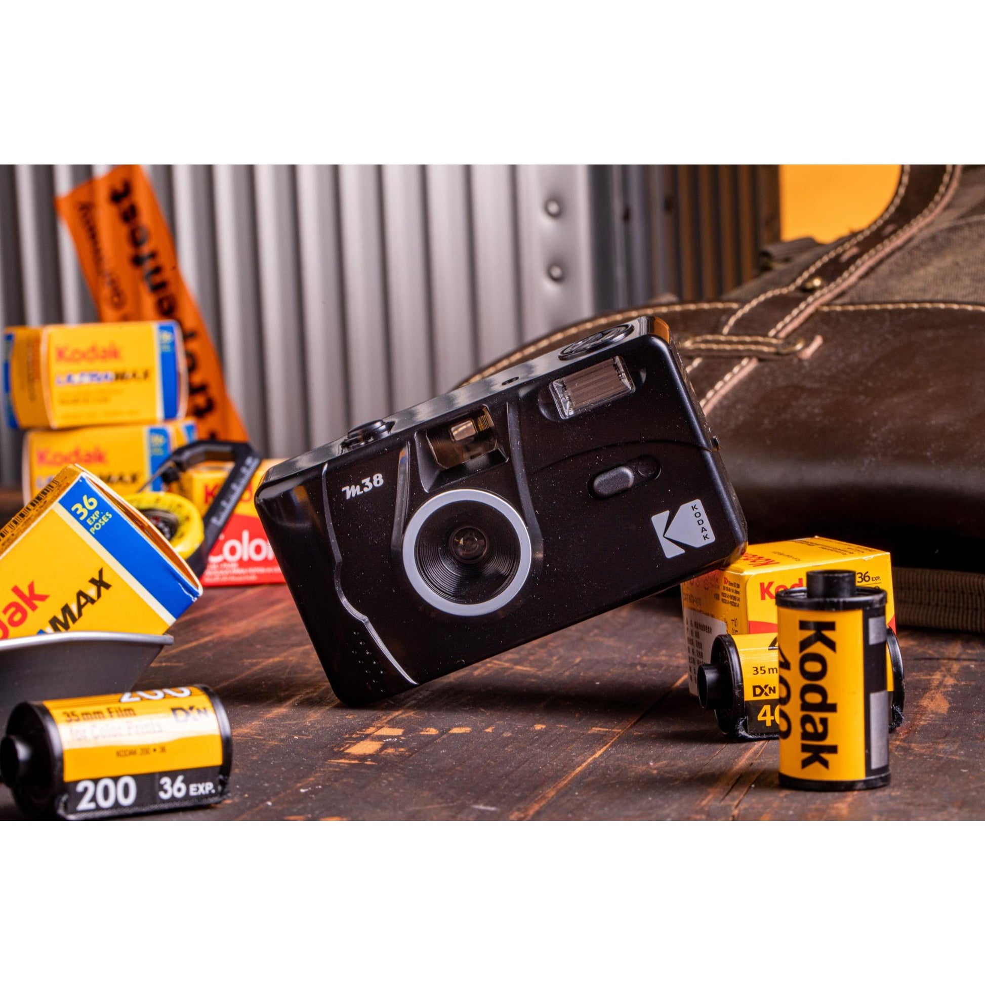Capture the memories. The M38 35mm Film Camera with Flash in Starry Black from Kodak is a small reusable film camera with built-in flash. This camera has a fixed focus lens, manual film winding and rewinding, and an on/off switch for the flash. It conveniently runs on one AAA alkaline battery and takes 35mm film.*