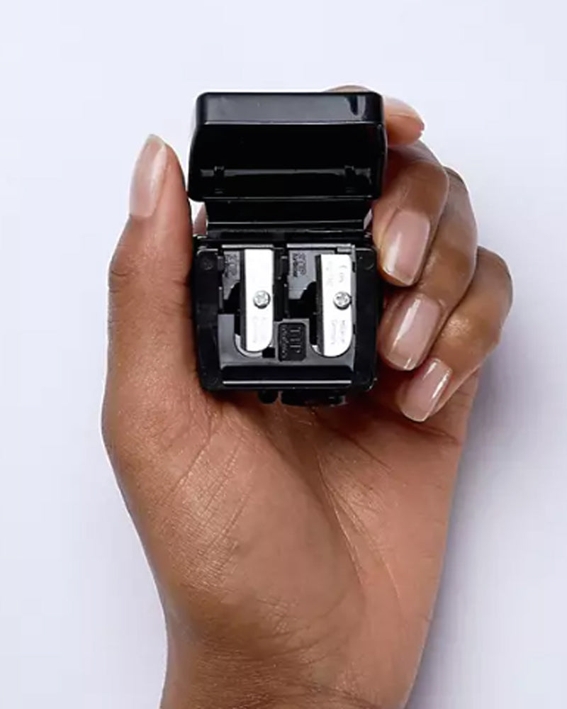 Our new universal sharpener provides an exacting, fine tip for a multitude of eye, lip and face pencils. Fitted with high-grade German stainless steel and a tip former within the sharpener, the blades give both a pointed tip for precision pencils and rounded tip for eye shadow and face pencils. Features a removable ring adaptor so it can be used with both regular and chubby pencils, while a plastic pick helps clean the blades, dislodging stubborn shavings. Packaged with a removable casing to hold shavings, keeping your cosmetic bag clean.