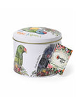 Parrots of Australia Tin. A round tin decorated with a selection of lovely Australian parrots. Artwork by Zinia King. Comes with 200 grams of Dark chocolate coated fruit and nut mix.
