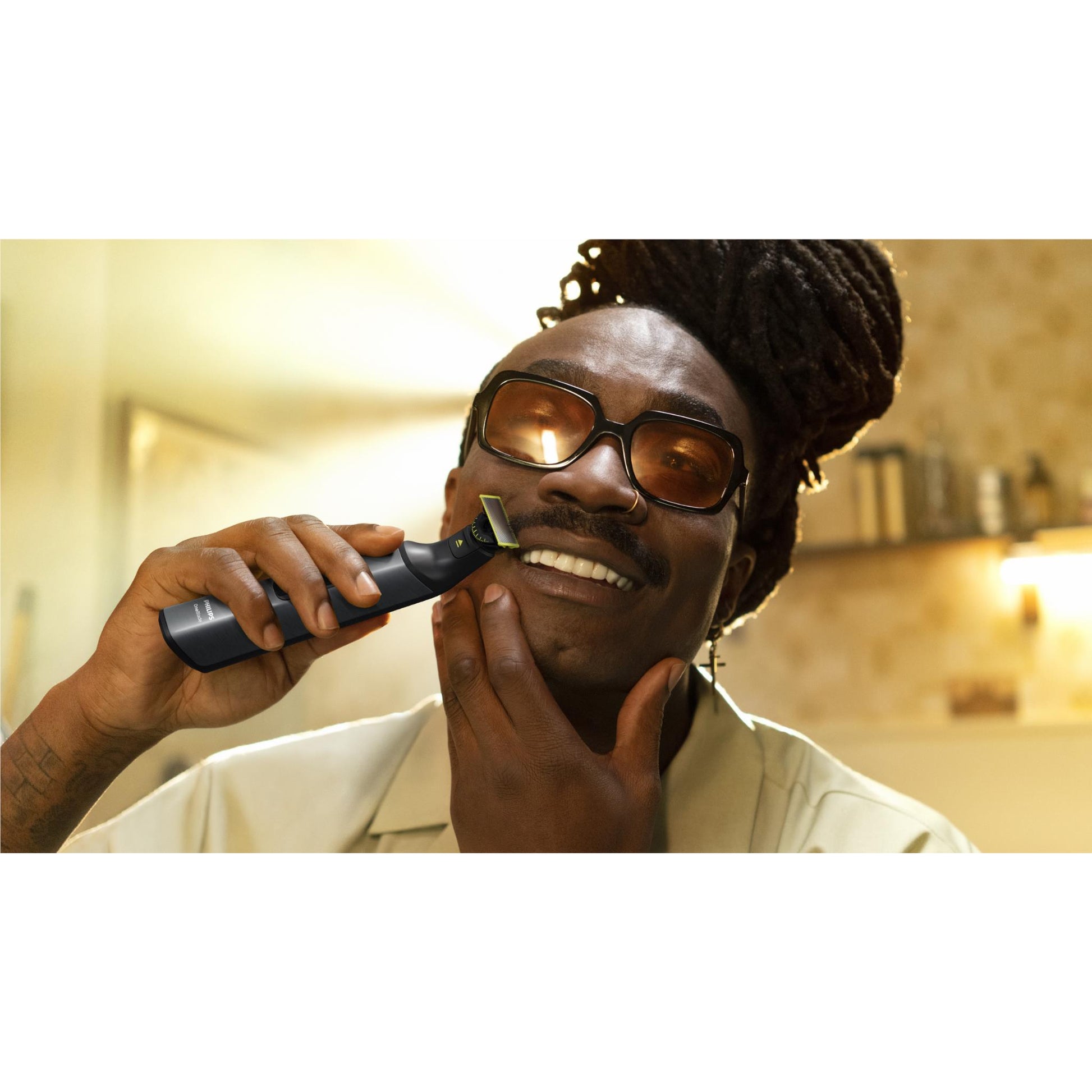 Philips OneBlade Pro Face + Body trims, edges and shaves any length of hair. You get a blade for your face, and one with a skin guard for your body. Forget about using multiple tools. OneBlade does it all.