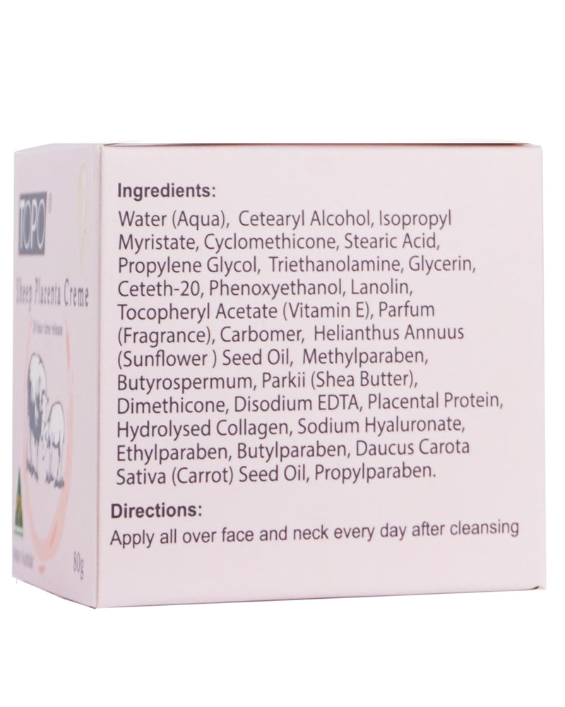 TOPO® Sheep Placenta Creme 24 hour time release is a unique high quality moisturising cream with Placenta Extract and Vitamin E and Lanolin. This specially designed cream will help your skin feel smooth and fresh throughout the day.